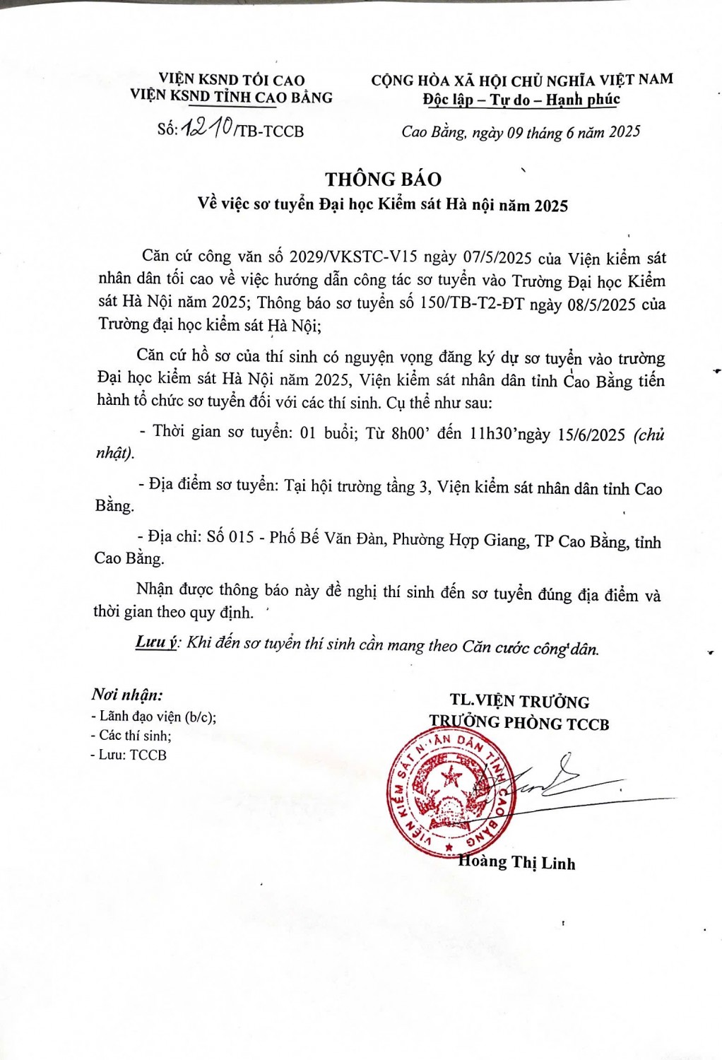 Thông báo về việc sơ tuyển Đại học Kiểm sát Hà Nội năm 2025