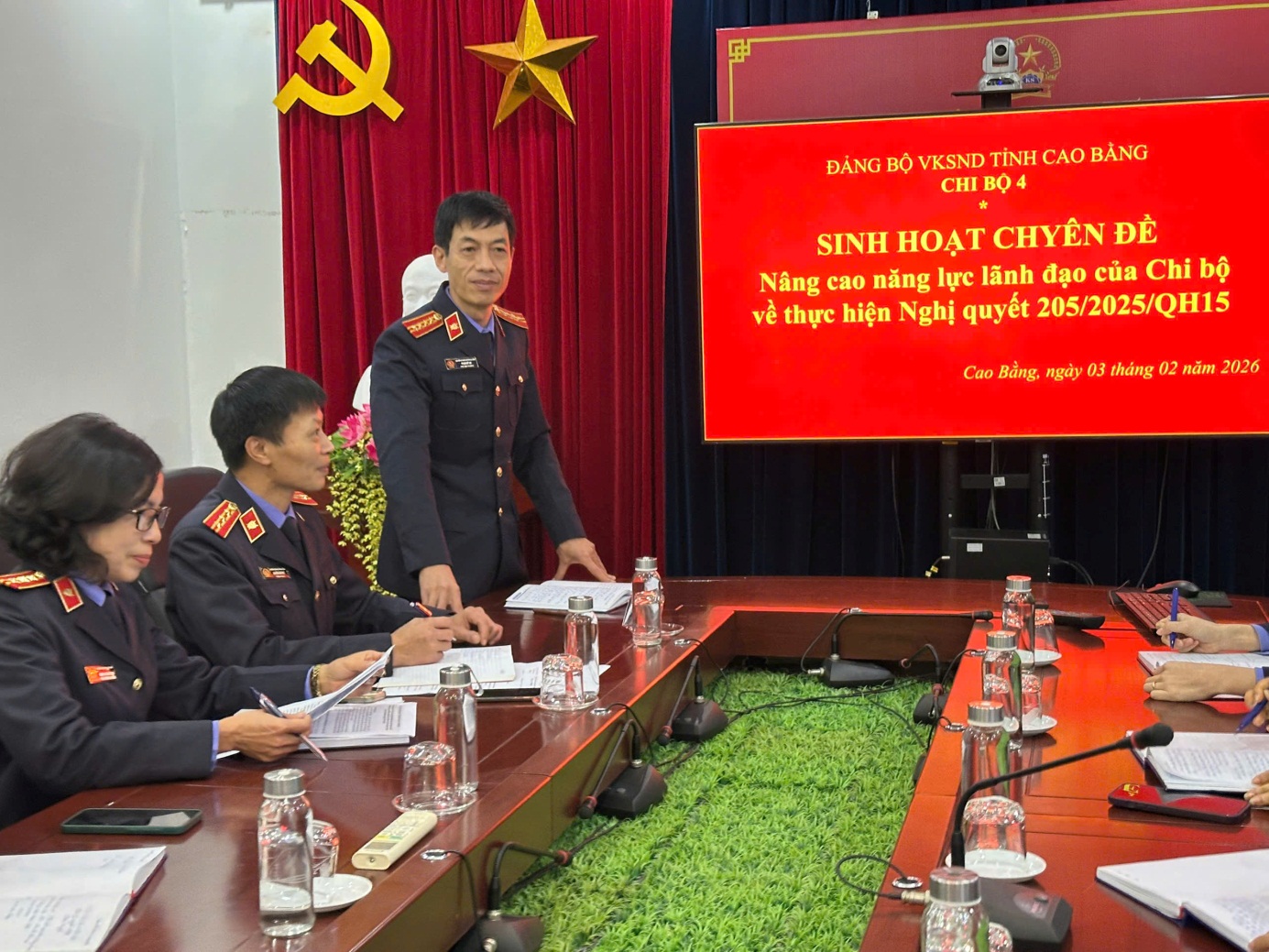 Chi bộ 4 đã quán triệt những nội dung cốt lõi, yêu cầu mới của Nghị quyết số 205/2025/QH15 của Quốc hội và các văn bản hướng dẫn thi hành; đồng thời đánh giá công tác chuẩn bị triển khai, nhấn mạnh vai trò tham mưu ban hành Kế hoạch số 23/KH-VKS ngày 26/12/2025 của Viện KSND tỉnh Cao Bằng và trách nhiệm rà soát, phát hiện các vụ việc có yếu tố lợi ích công và nhóm yếu thế.