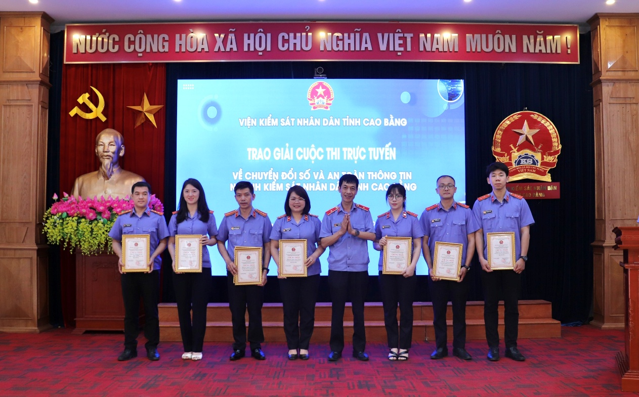 Cũng tại Hội nghị, Hội đồng thi đua khen thưởng đã tiến hành trao Bằng khen của Viện trưởng VKSND tối cao đối với 01 tập thể và 01 cá nhân; Giấy khen của Viện trưởng VKSND tỉnh đối với 02 cá nhân có thành tích xuất sắc đột xuất; trao giải thưởng đối với 7 cá nhân và 01 tập thể đã có thành tích xuất sắc trong “Cuộc thi trực tuyến về chuyển đổi số và an toàn thông tin trong ngành Kiểm sát nhân dân tỉnh Cao Bằng”.