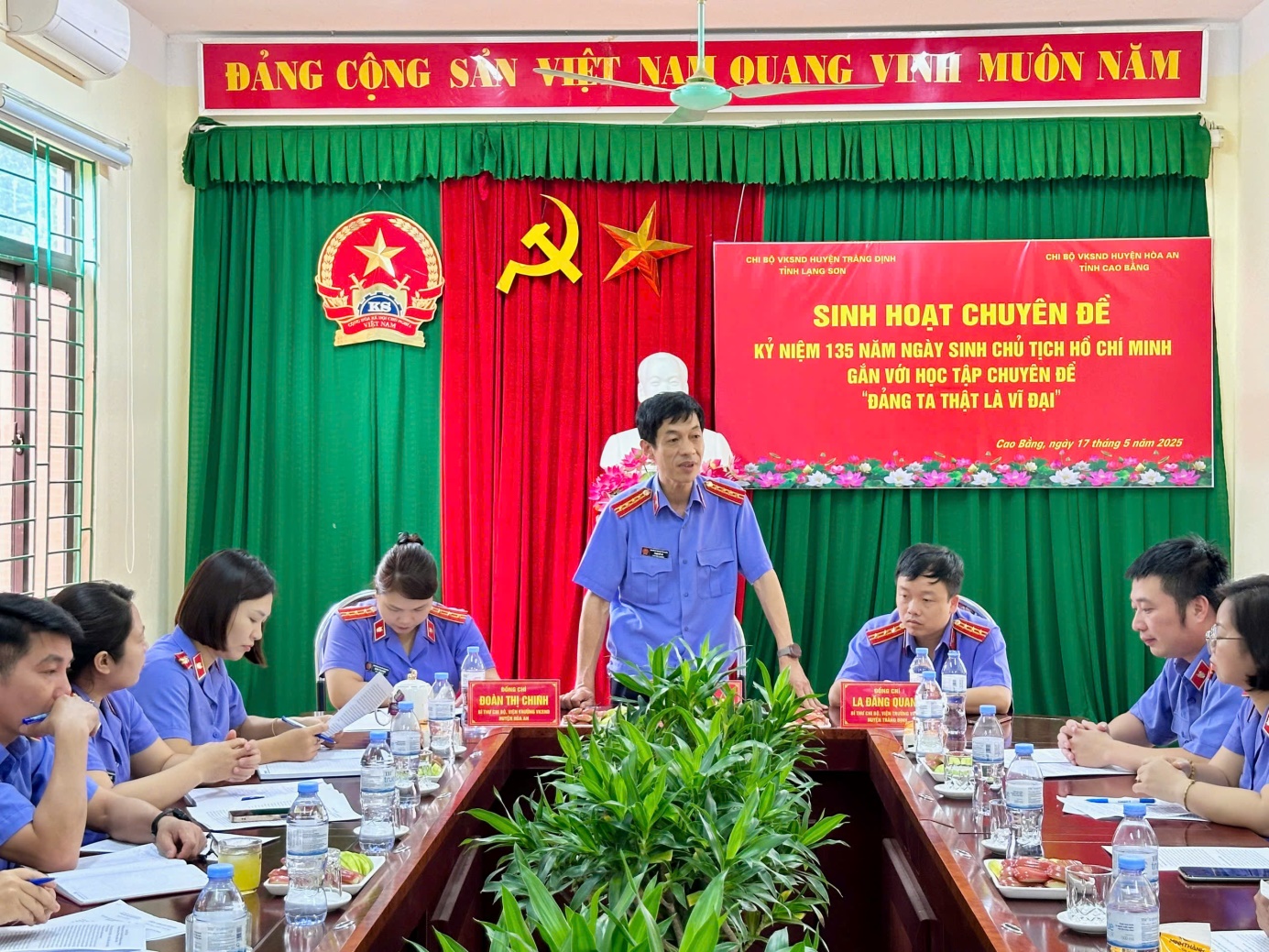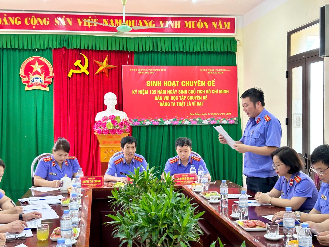 Thực hiện Kế hoạch phối hợp giữa hai Chi bộ, ngày 17/5, Chi Bộ VKSND huyện Hoà An, tỉnh Cao Bằng và Chi bộ VKSND huyện Tràng Định, tỉnh Lạng Sơn do đồng chí La Đăng Quang - Bí thư Chi bộ, Viện trưởng VKSND huyện Tràng Định làm trưởng đoàn, long trọng tổ chức sinh hoạt chuyên đề Kỷ niệm 135 năm Ngày sinh Chủ tịch Hồ Chí Minh gắn với học tập chuyên đề “Đảng ta thật là vĩ đại”. Tới dự và chỉ đạo buổi sinh hoạt có đồng chí Phạm Mỹ An - Ủy viên Ban chấp hành Đảng bộ, Phó Viện trưởng VKSND tỉnh Cao Bằng.